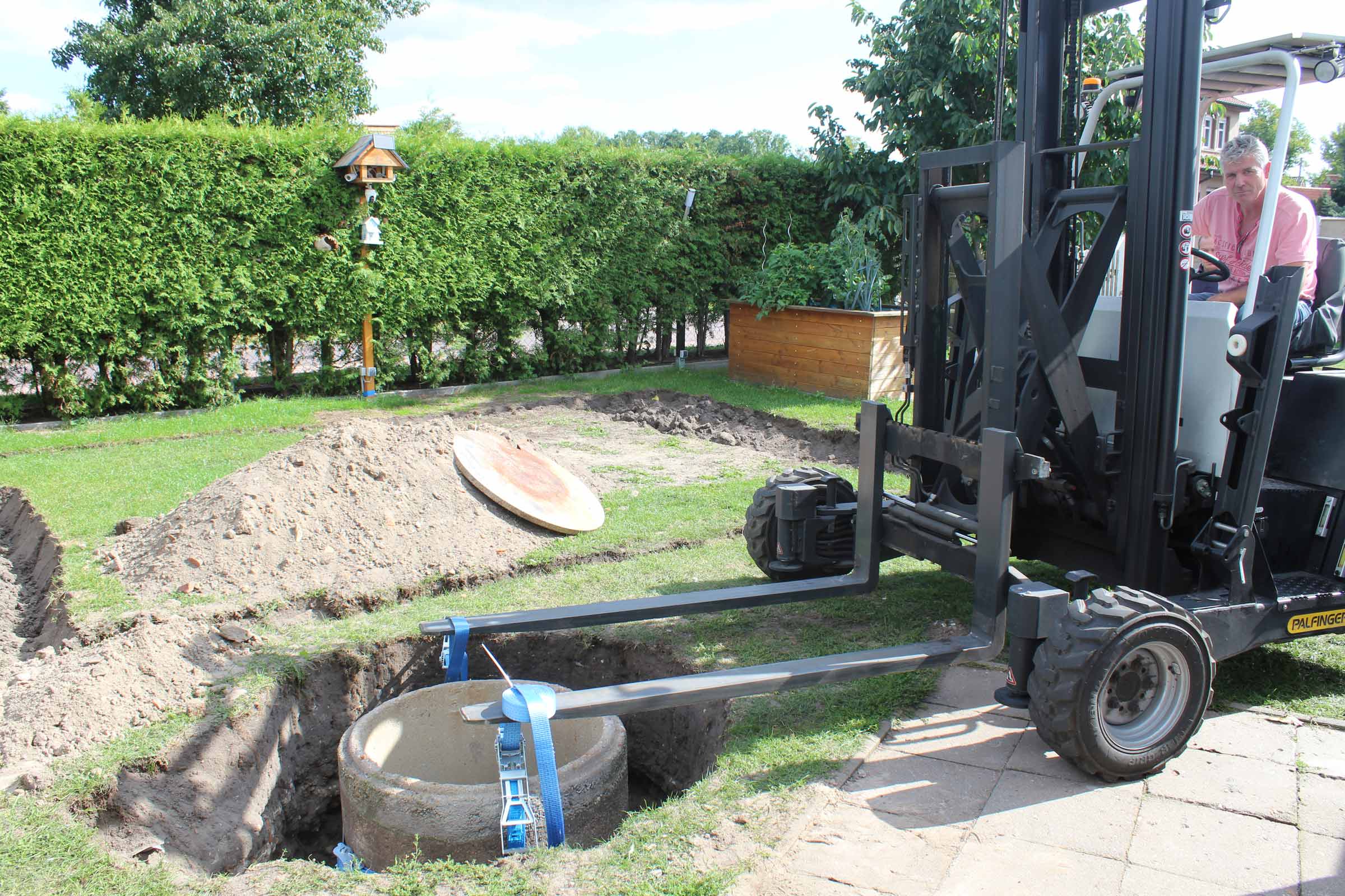 Der Onkel meiner Frau ist LKW-Fahrer und hat unseren Plan gesehen. „Ich habe doch einen Stapler am LKW, damit kann ich den Brunnenring rausheben.“ Klar kann er das. 🙂 Und wir haben dann ein paar Tage Zeit, bis Freitag der Bagger kommt, um den Brunnen so weit vorzubereiten, dass der Ring mit dem Bagger wieder eingesetzt werden kann. Klasse Plan, so machen wir das.
